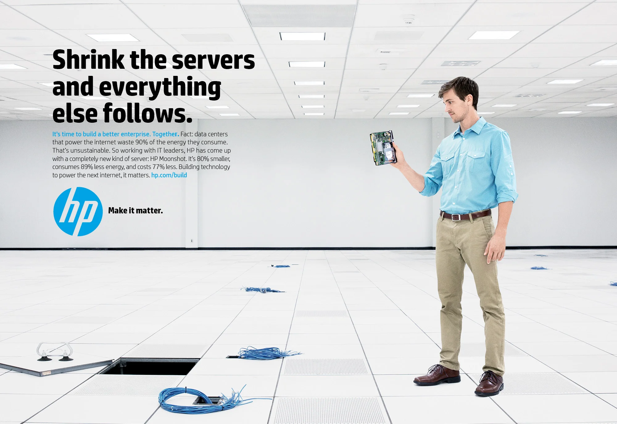 HP Moonshot is engineered to meet entire world’s digital demands. It’s 80% smaller and uses 89% less energy than traditional servers, making it exceptionally efficient. To highlight its revolutionary design, we showcased the modern world's digital demands within a single server room.